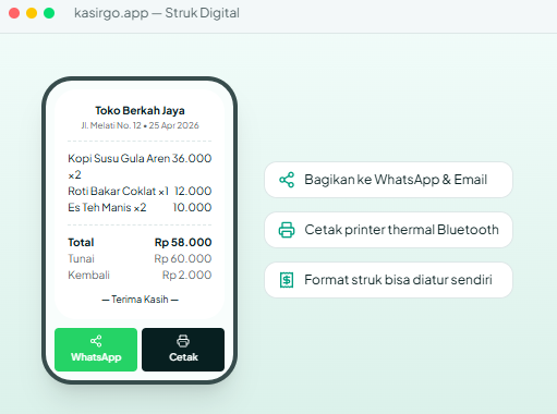 Bagikan via WhatsApp/Email atau cetak printer Bluetooth thermal.